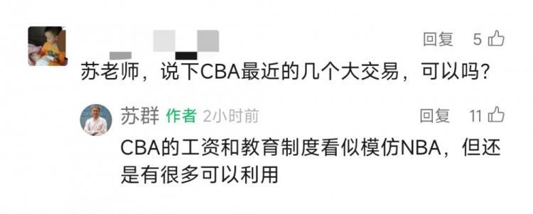 直播吧9月4日讯 近日,评论员苏群在评论区和网友互动。谈到CBA近期的大交易,他说:“CBA的工资和交易制度看似模仿NBA,但还是有很多可以利用。”...